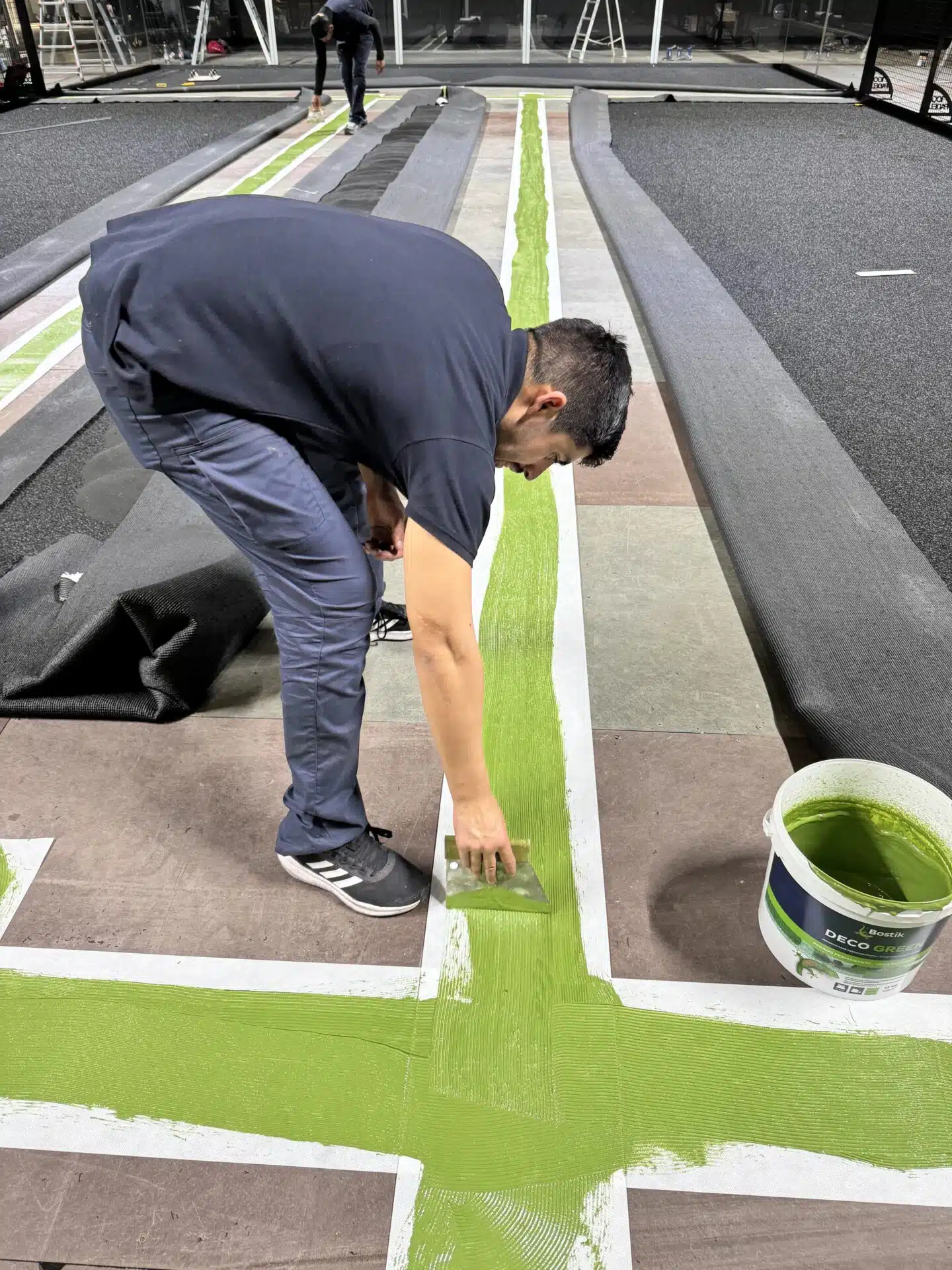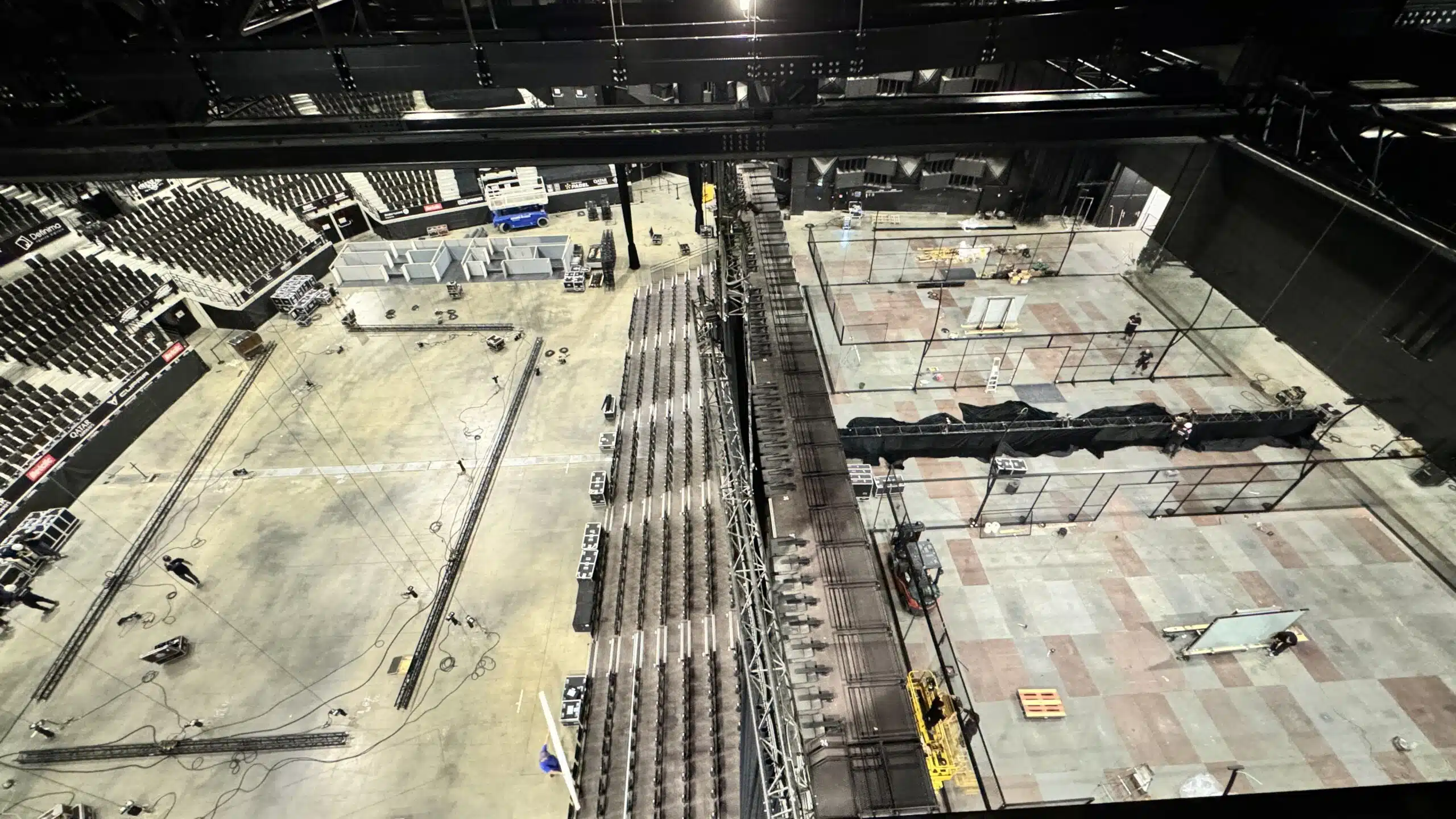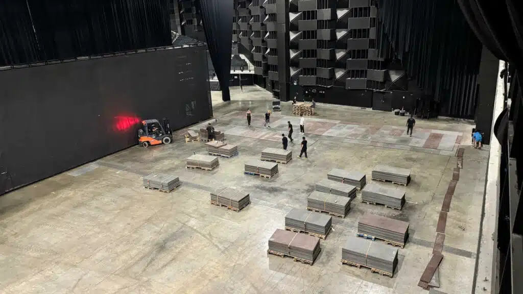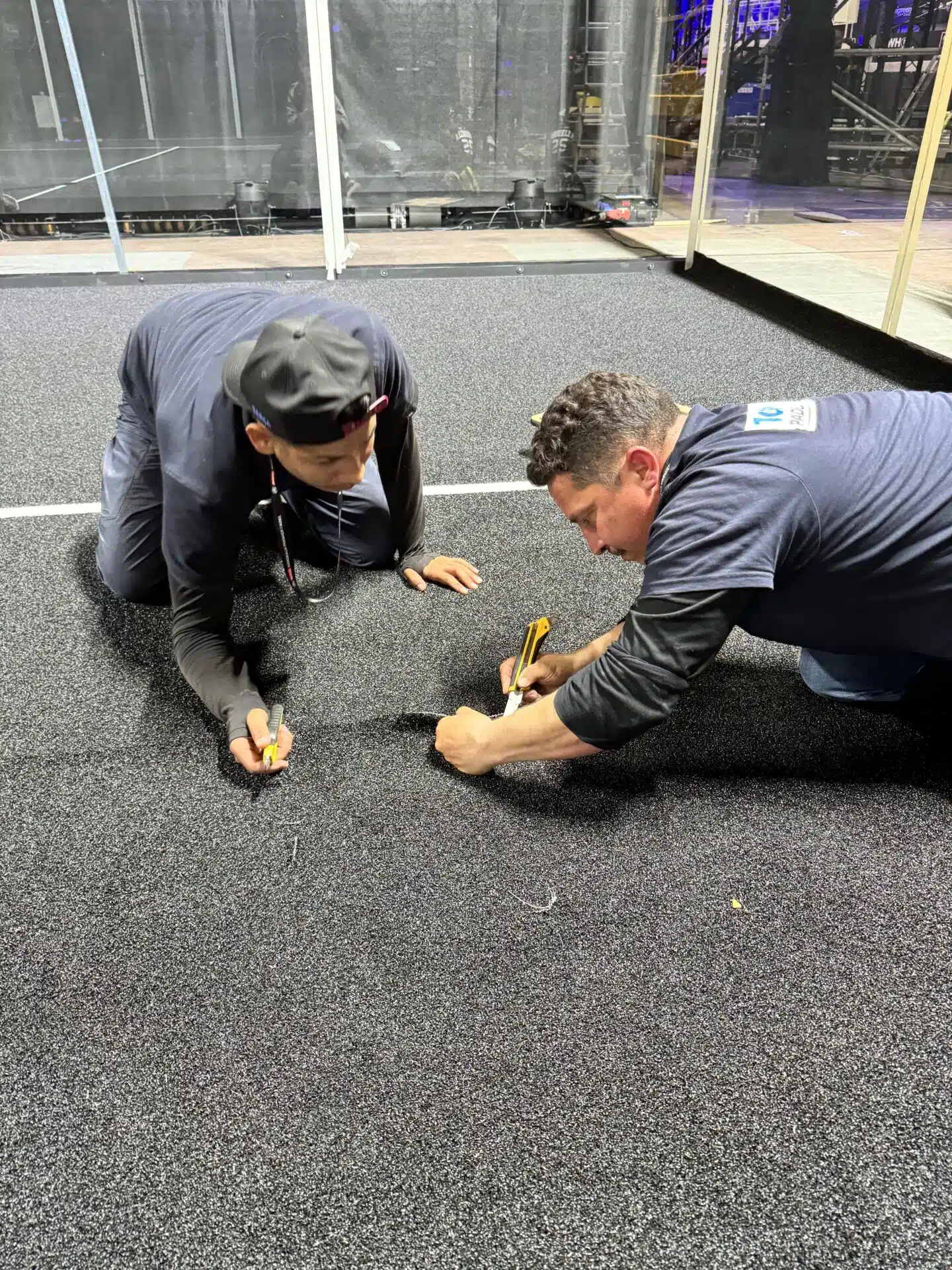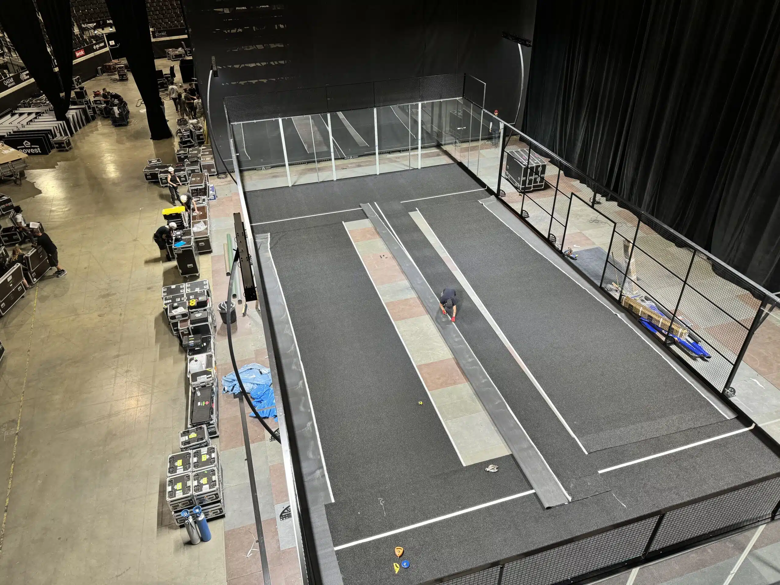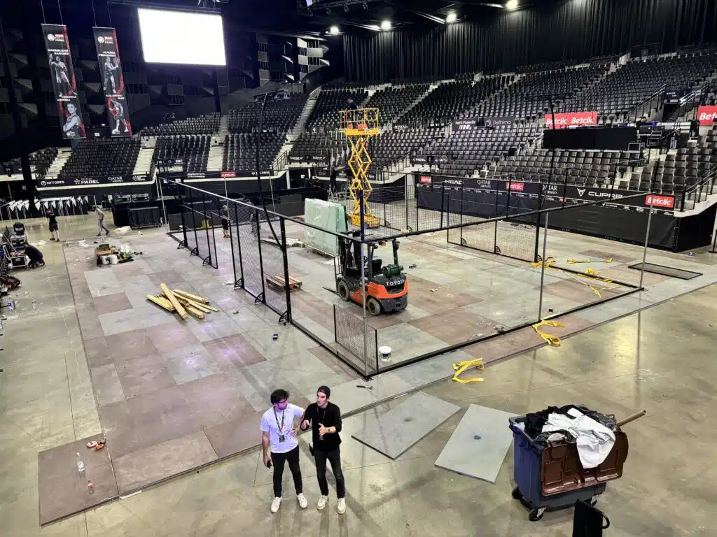 Careful preparation of the floor and structures. We worked day and night in this magnificent event hall, which is the Arkea Arena in Bordeaux.